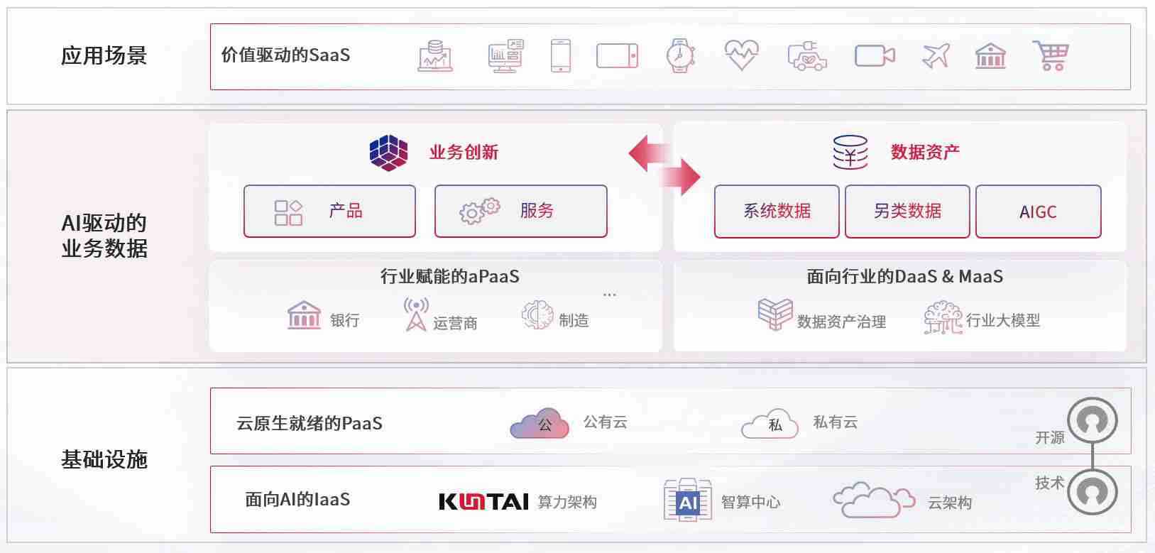 数字时代,,围绕企业数字化转型的关键要素,,,,TOP1体育数码开创性的提出数云融合战略和技术体系框架,,,着力在云原生、、、数字原生、、AI原生和信创产业上架构产品和服务能力,,为处在不同数字化转型阶段的快消零售、、汽车、、、、金融、、、、医疗、、、政企、、教育、、运营商等行业客户提供泛在的敏捷IT能力和融合的数据驱动能力,,,,构建跨界融合创新的数字业务场景和新业务模式,,助力企业级客户建立面向未来的核心能力和竞争优势,,,全面推动社会的数字化、、、、智能化转型升级。。。