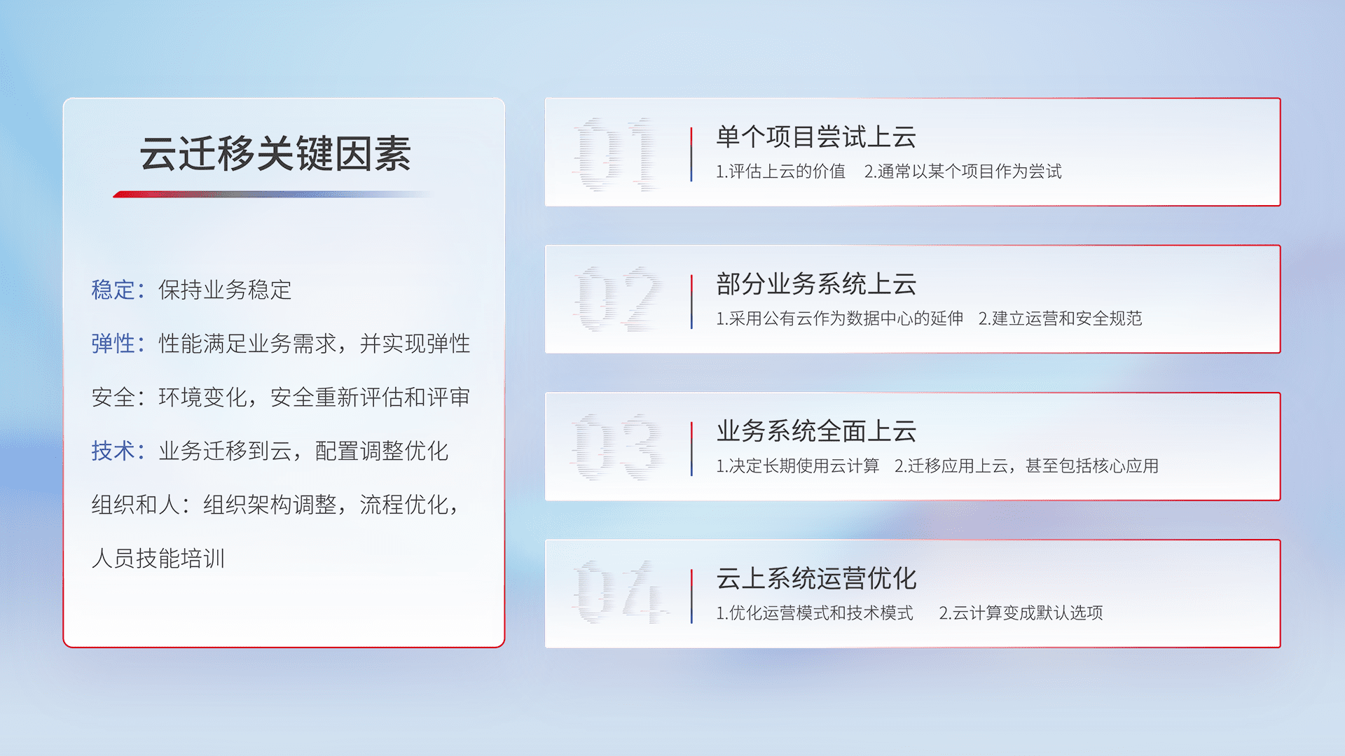 结合实际业务,,从规划设计、、云平台选型、、、、云原生改造、、、数据迁移、、、、集成交付,,,迁移全过程为客户识别最佳上云路径,,,,做好风险识别管理,,,,设计网络架构、、、身份权限、、安全审计合规、、、操作审计、、、、日志审计、、、监控告警策略、、、多站点容灾设计等,,对云上基础设施进行整体规划,,,,提升IT治理水平,,,,以满足弹性、、、高可用、、高性能的需求。。。
